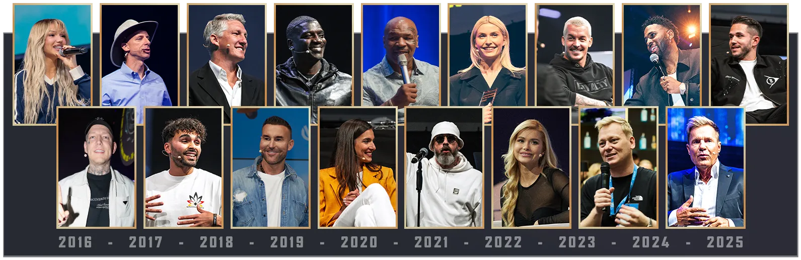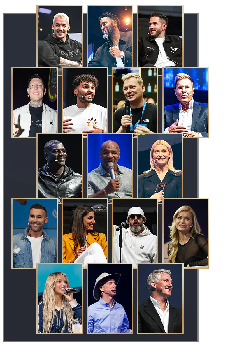 In den vergangenen Jahren standen wahre Größen der Unternehmerwelt, herausragende Erfolgspersönlichkeiten und prominente Visionäre auf unseren Bühnen. Diese Speaker sind das Vermächtnis unserer Geschichte und zugleich das Versprechen für die Zukunft. Auch in diesem Jahr liefern wir wieder: Bereite dich auf ein Line-up vor, das alle bisherigen Maßstäbe übertreffen wird.